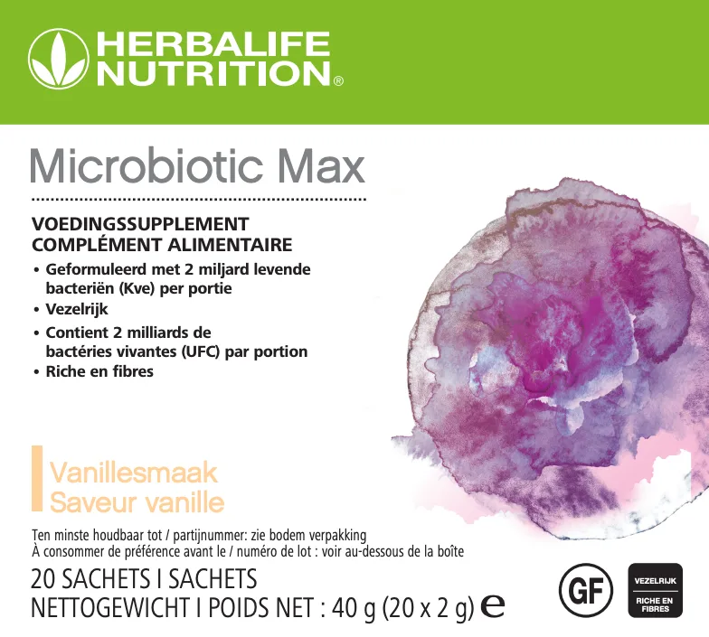 Microbiotic Max is een voedingssupplement in poedervorm dat je darmfunctie helpt ondersteunen. Het is precies zo geformuleerd om jou een combinatie te bieden van levende ‘goede bacteriën’ en prebiotische vezels, die in harmonie samenwerken. Iedere portie bevat 2 miljard levende bacteriën van de stammen Bifidobacterium lactis en Lactobacillus helveticus. Dit product is rijk aan vezels en verkrijgbaar in zakjes poeder, waardoor het perfect is om mee te nemen onderweg.